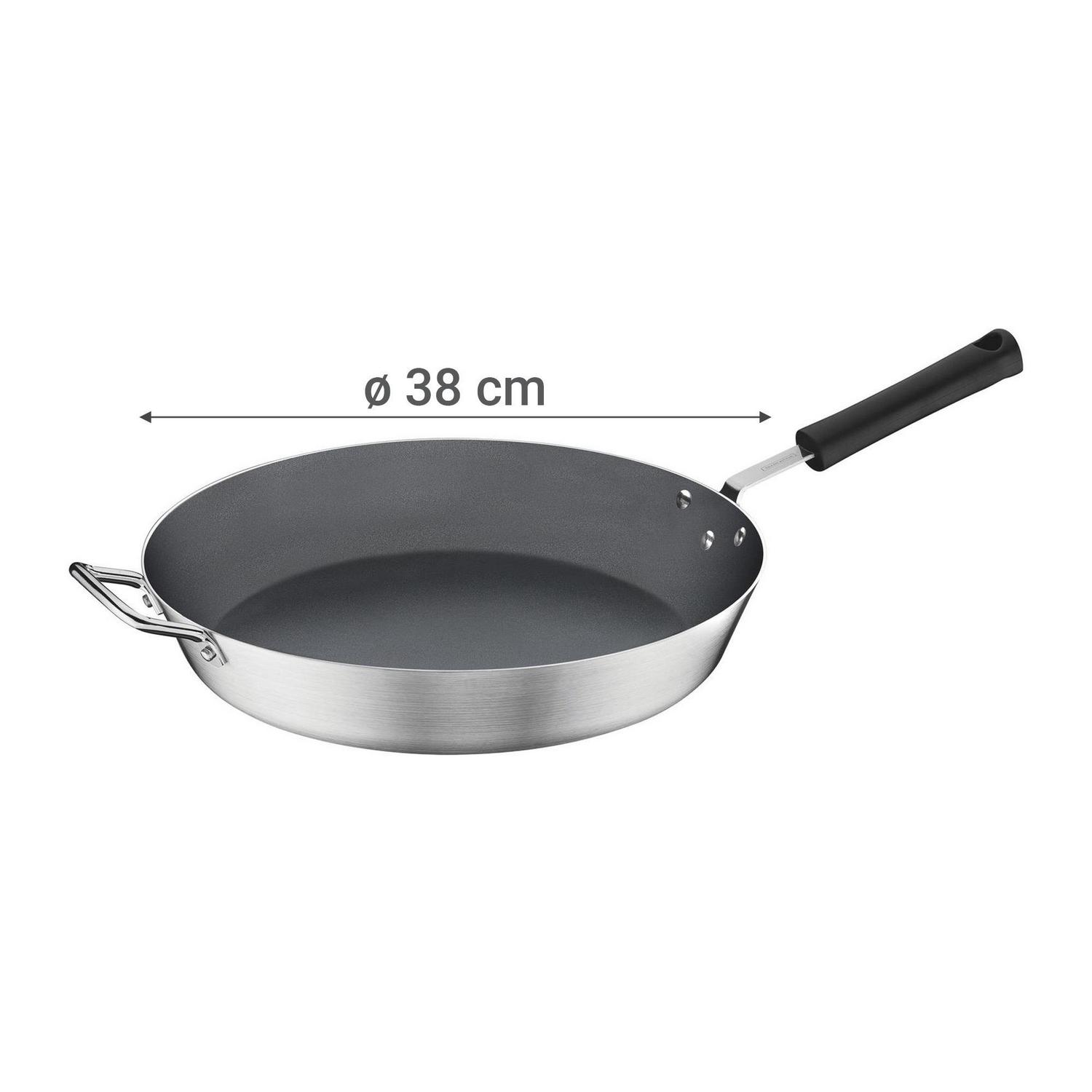 Dale un toque profesional a tu cocina con esta sartén Tramontina de 38 cm de diámetro. Fabricada en aluminio, con un recubrimiento interior esmaltado y antiadherente, esta sartén te permitirá cocinar tus platillos favoritos de manera fácil y eficiente. Su diseño industrial y color negro le dará un toque moderno a tu cocina. Apto para lavavajillas, su limpieza será muy sencilla.