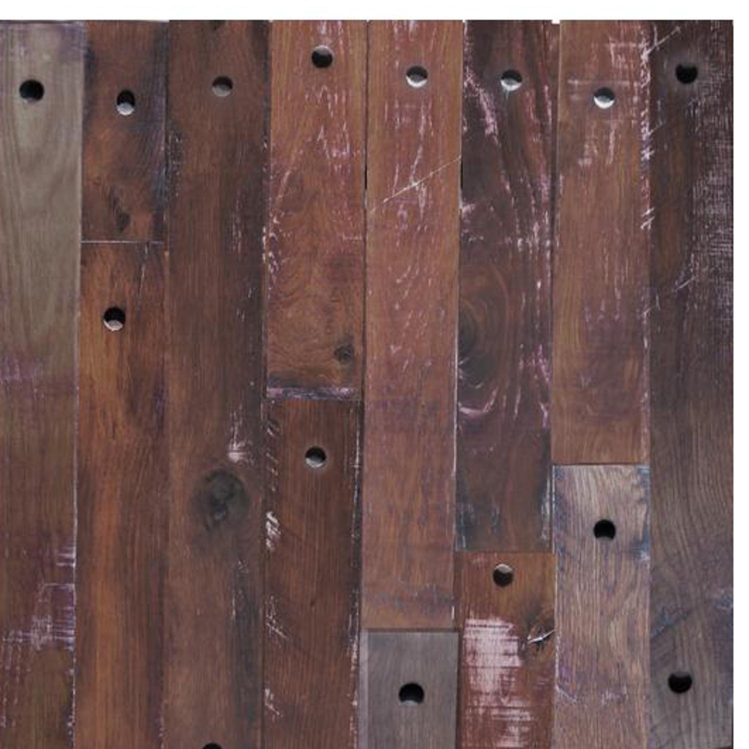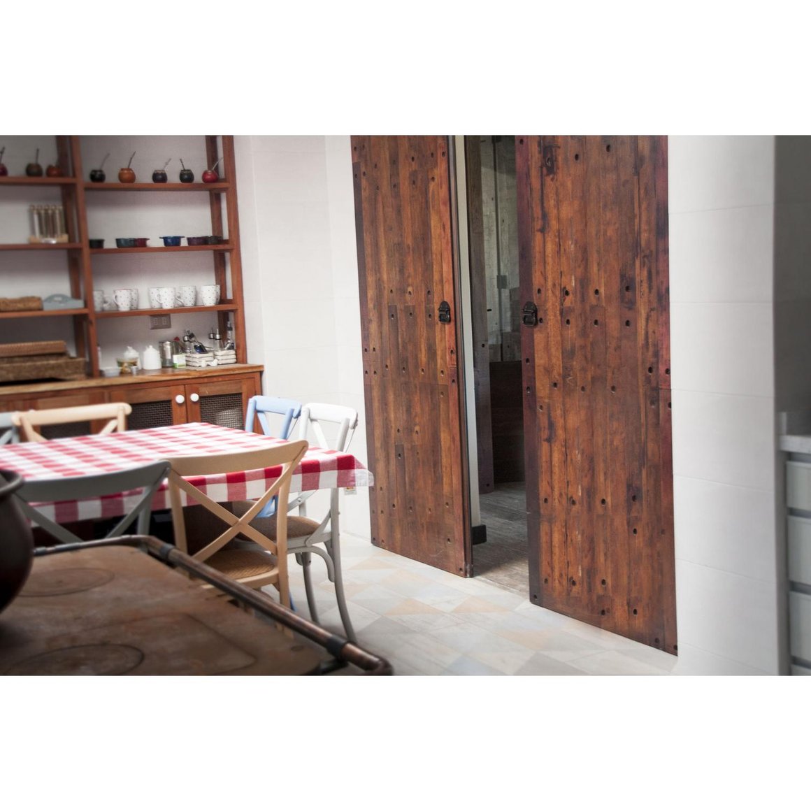 | Características | Puerta fabricada en madera de Lenga solida y enchapada en madera reutilizada de barracas de Vino, lo que le da su caracteristico color burdeo opaco tipo concho de vino. |