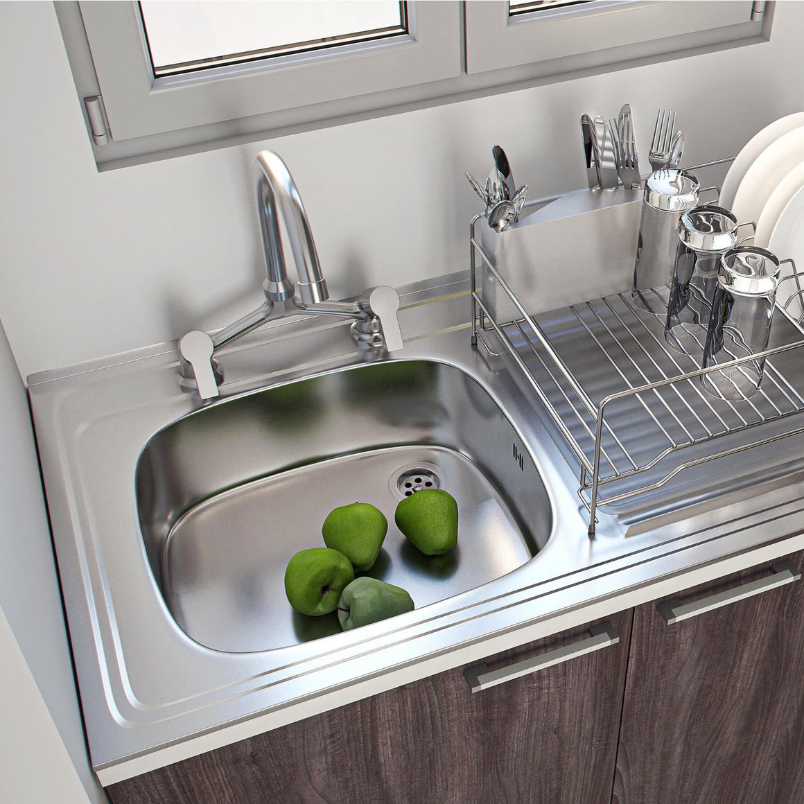Esta combinación lavaplatos cuenta con una sola llave tipo pomo, ideal para la cocina. Su sistema de fijación rápida facilita la instalación. Ahorra agua con su consumo de 9 litros por minuto. Fabricada con materiales libres de plomo, es una opción segura para tu familia. El color del producto es cromo, y viene con un set de fijaciones.