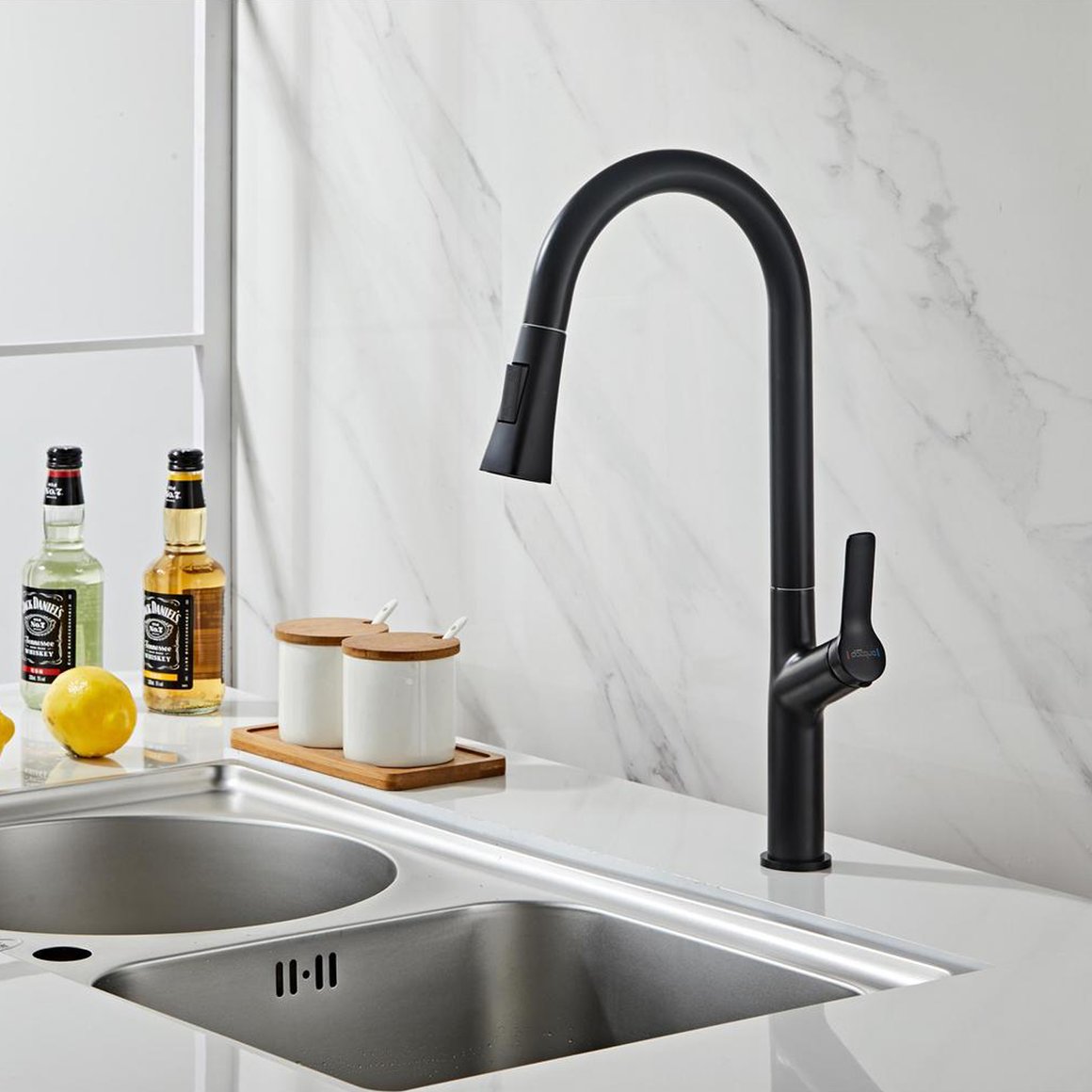 Dale un toque moderno y elegante a tu cocina con el monomando de cocina Vera extensible negro mate. Su diseño minimalista y boquilla de arco alto le dan un toque distintivo a tu ambiente, mientras que su flexibilidad te permite llegar a todos los rincones de tu lavaplatos sin salpicaduras. Además, su acabado negro mate le da un toque sofisticado a tu cocina y es fácil de limpiar.