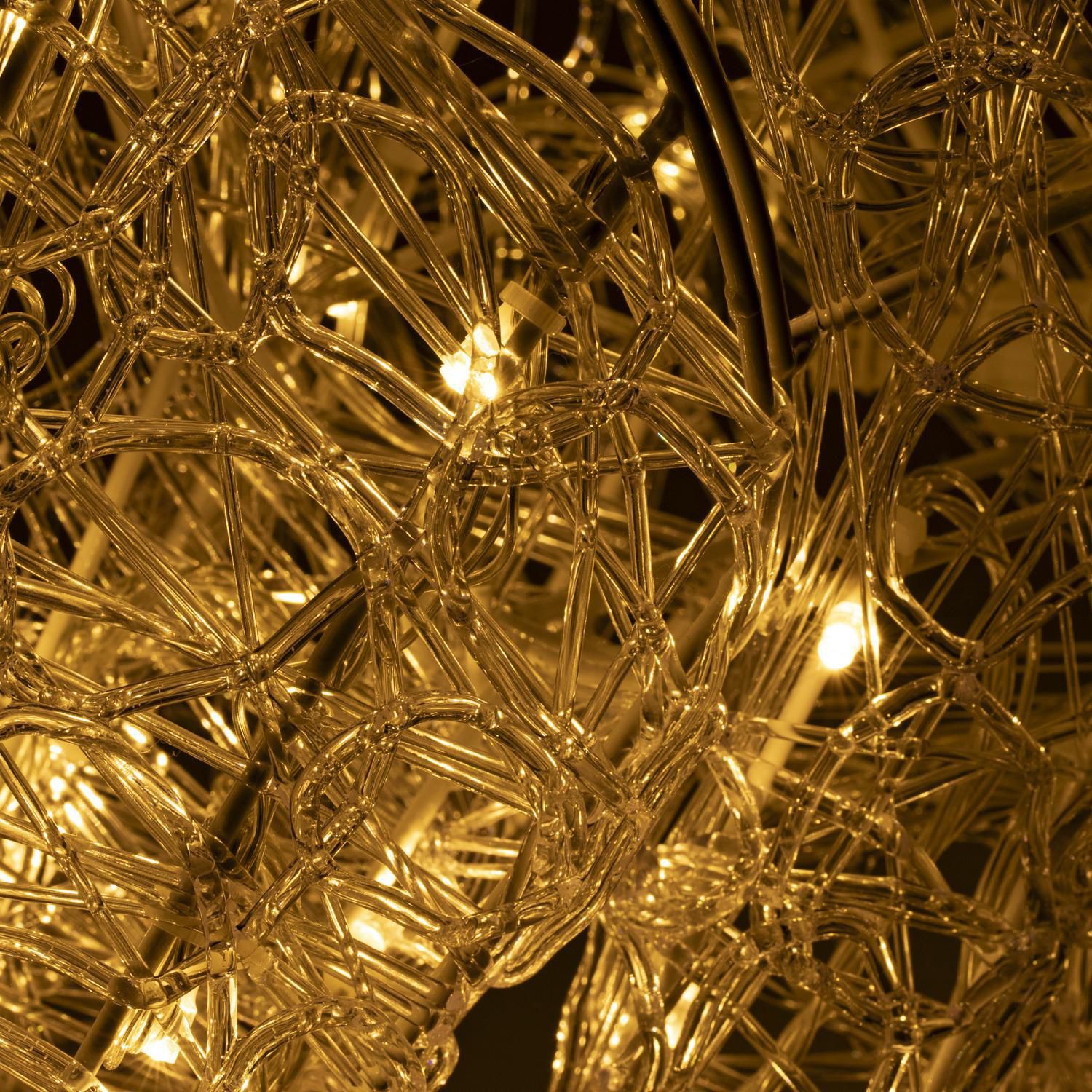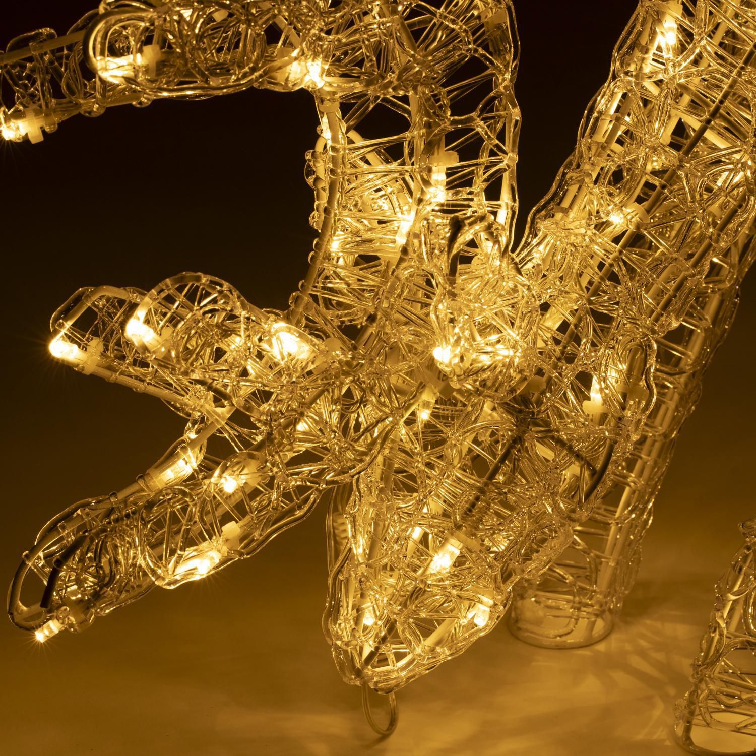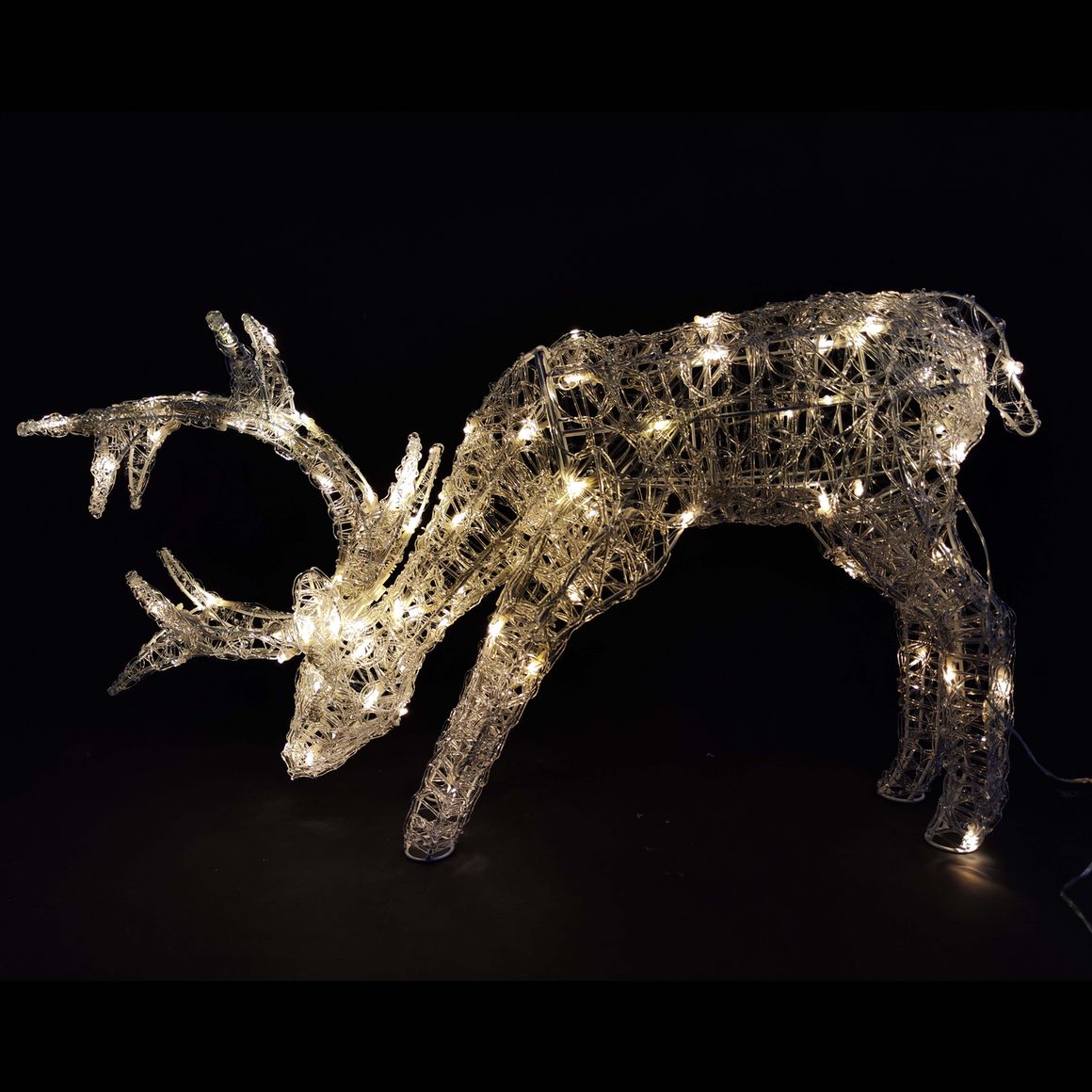 Este reno con luces está hecho de acrílico, metal, cobre y plástico, lo que lo hace resistente y duradero. Cuenta con 60 luces LED que emiten una luz cálida, creando un ambiente acogedor y festivo. El reno es ideal para decorar tu hogar, jardín o cualquier espacio que desees ambientar con el espíritu navideño.